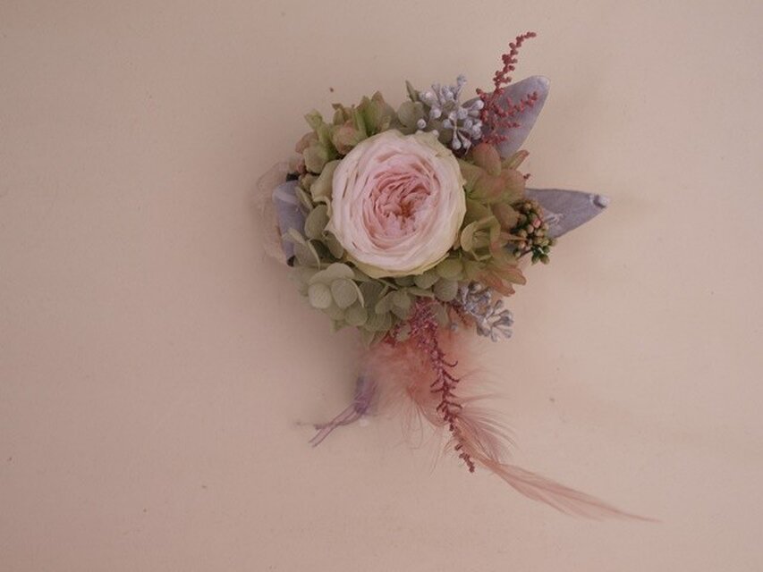 そんなニュアンスカラーのローズにライムロゼ色のアジサイや白いユーカリ、羽などを合わせたふんわりとした優しい雰囲気に仕上げました。