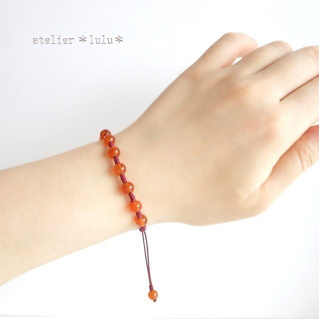 カーネリアンを深い赤色の紐でブレスレットに。