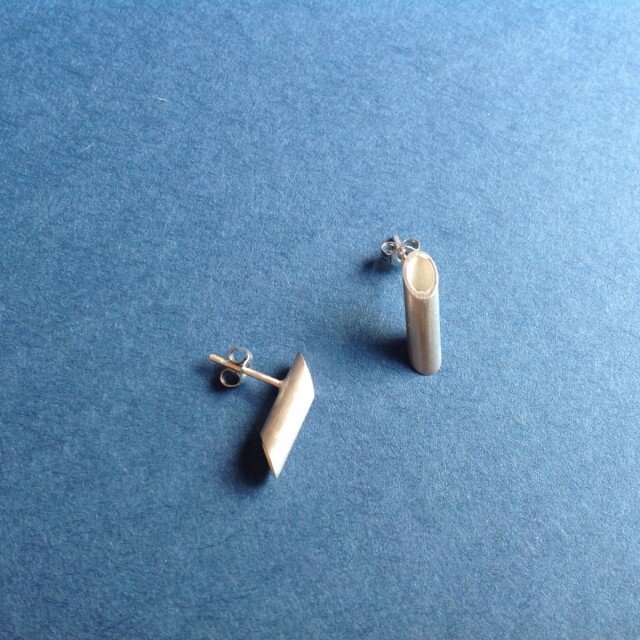 Ag950のパイプのシンプルなピアスです。表面はヘアライン仕上げ、斜めにカットした断面は鏡面仕上げなので、反射光が綺麗です。