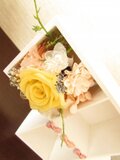ミルクイエローのローズを中心に、ふんわりお菓子のようなあじさい、パールやシフォンのリボンでできた木の実のピックを挿して、思わずこぼれ落ちそう。