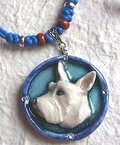 陶製のペンダントに編みこみコットンコード(ブルー)を