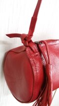 斜め掛けようの紐は1センチ幅の革を2枚あわせにして結び目を結び安いように一重の革を縫い付けてたしています。