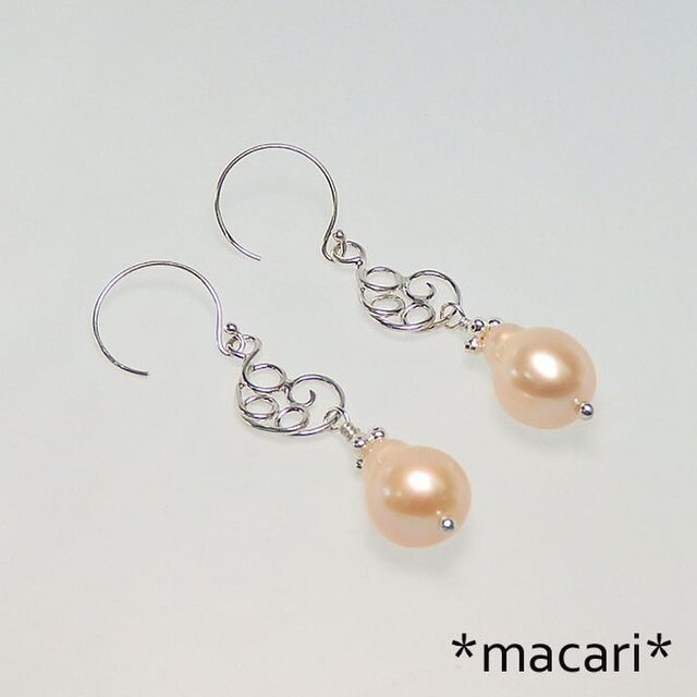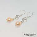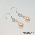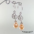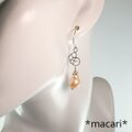 淡いオレンジ系の淡水ツインパールを飾り付けた個性的なピアスです。