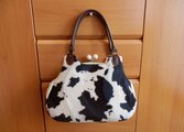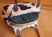 毛足の短いリアルなホルスタインファーとコットンリネンのブラックウォッチタイプのブロックチェックのキャンバスで、あおりポケットが便利ながま口バッグを作りました。