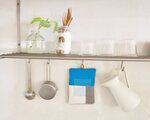 ターコイズブルー、ホワイトの糸でちくちくをしたなべつかみです。
