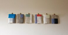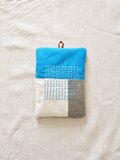 ターコイズブルー、ホワイト、グレーのリネン生地をパッチワークし、