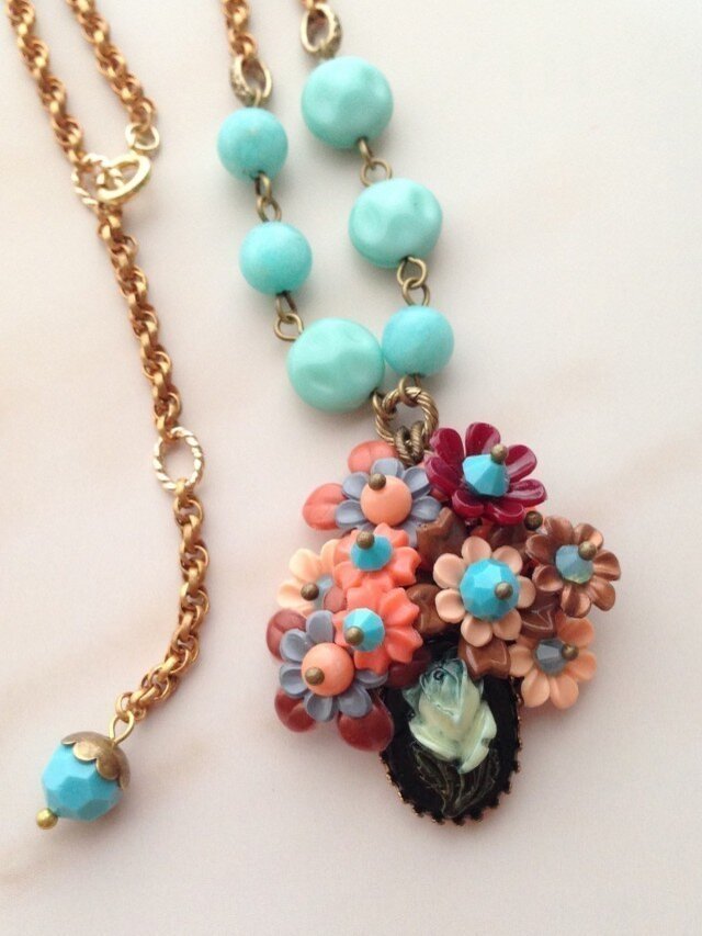 50年ほど前の型抜きの小花ビーズにスワロフスキーや珊瑚玉を散りばめて