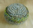 リネンとウールを混ぜた手紡ぎ糸で編んだ小物入れです。