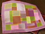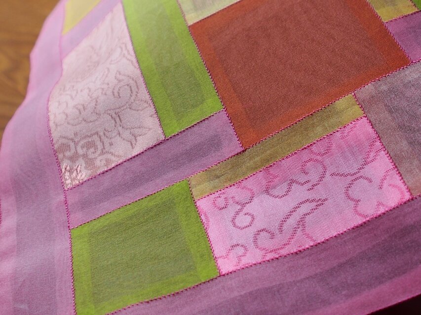 久しぶりに作品が出来上がりました。韓国パッチワーク、ポジャギの技法のテーブルセンターです。シルクオーガンジーに似たノバンという素材をメインに使用し、何か所か織り模様入りの布(スコサ)も使いました。どちらも絹ですが張りとシャリ感があります。大きさは32センチ×25センチ。ピンクの絹糸でかがりました。