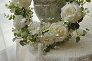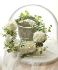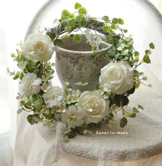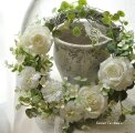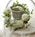 白とグリーンのユーカリをベースにして、白い小花と、丸顔が愛らしいバラを飾りました。ハートカズラの蔓も遊んでいます。蔓に白い鳥もそえました。鳥の飾りは取り外しができます。