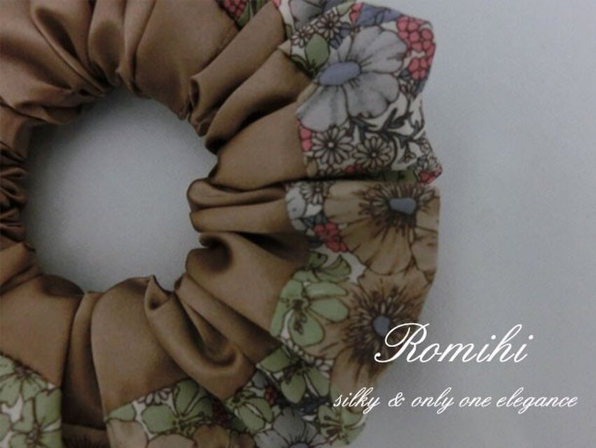 ブラウンの花柄が特徴的なリバティ(グロリアフラワーズ)と茶系のローアンバーサテンを組み合わせたシュシュです。リバティは全体的に少しくすんだようなシックな色合いで、大人のおしゃれにぴったりです♪