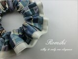 いろいろなチェック柄を繋ぎ合わせたような柄のリバティ サム(青系) をオフホワイトサテンでふちどりしたシュシュです。チェック柄がかわいいです♪