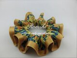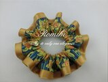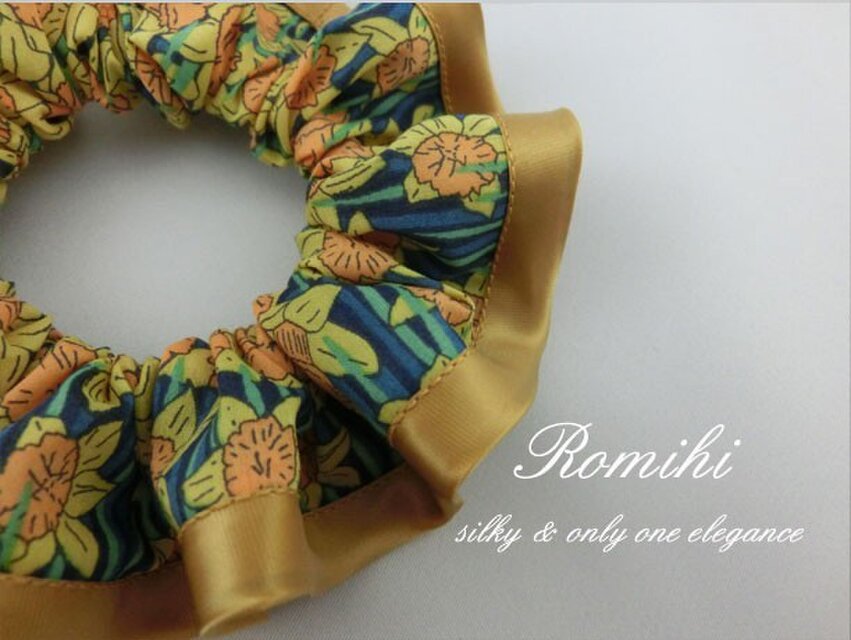 らっぱすいせんがストライプ状に描かれたリバティヒューバートをマスタードに近いゴールドサテンでふちどりしたシュシュです。黄色いすいせんの柄がとっても素敵♪