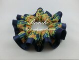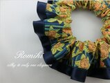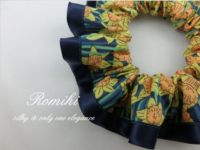 らっぱすいせんがストライプ状に描かれたリバティヒューバートをネイビーサテンでふちどりしたシュシュです。黄色いすいせんの柄がとっても素敵♪