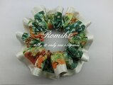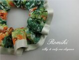 水彩の総柄でグリーンとオレンジがきれいに重なり合った柄のリバティ メアリー・ジーンをオフホワイトサテンでふちどりしたシュシュです。配色がきれいな生地です♪