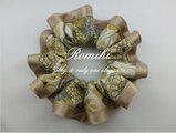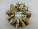 白地に深い黄色系やグレーの大き目の花柄が描かれたリバティ生地をベージュ色のサテンで縁取りしたシュシュです♪ボリューム感は少なめですが、洋服の邪魔をしない適度な大きさです♪