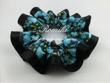 スイートピーの柄のリバティ生地を黒いサテンで縁取りしたシュシュです♪ビビットな水色が黒に映えて、きれいな柄です♪