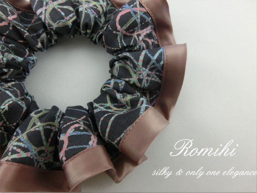 濃いめのグレー地にチェーンのような柄が描かれたリバティカーリーワーリーをローズグレーサテンで縁取りしたシュシュです♪