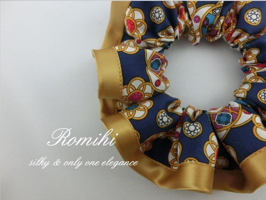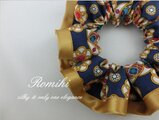 リバティファブ(ネイビー)をゴールドサテンで縁取りしたシュシュです♪ハンプティ・ダンプティをヒントに、ロシアのエッグジュエリーを思わせる装飾をほどこした柄だそうです☆
