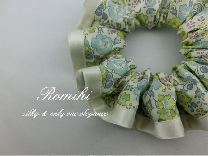 人気柄「フェリシテ」を75%に縮小したリバティをオフホワイトサテンで縁取りしたシュシュです♪透き通るようなグリーンで、新春らしい色あいです☆