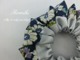紺色地に大き目の花がプリントされたリバティとグレーサテンを組み合わせたシュシュです♪紺色とグレーがマッチして大人っぽいです。