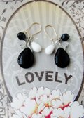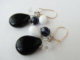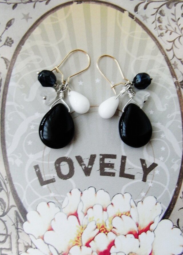 大きめのつるんとしたフラットドロップと、フラワーモチーフやころんと小さ目ドロップのチェコビーズを使い、可愛らしく仕上がっています。