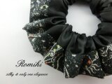 黒地にいろいろな星座が描かれたリバティ生地と黒いサテンを組み合わせたシュシュです♪夜の星空のような柄がかわいいです。