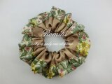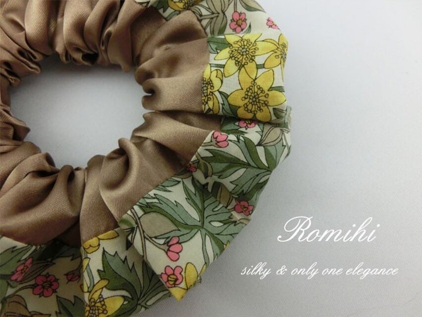 シックで落ち着いた色のリバティ(ジューンズスカーレット)と茶系のローアンバーサテンを組み合わせたシュシュです♪落ち着いたグリーンと黄色が大人っぽいです。