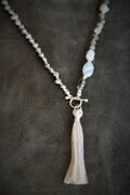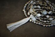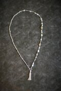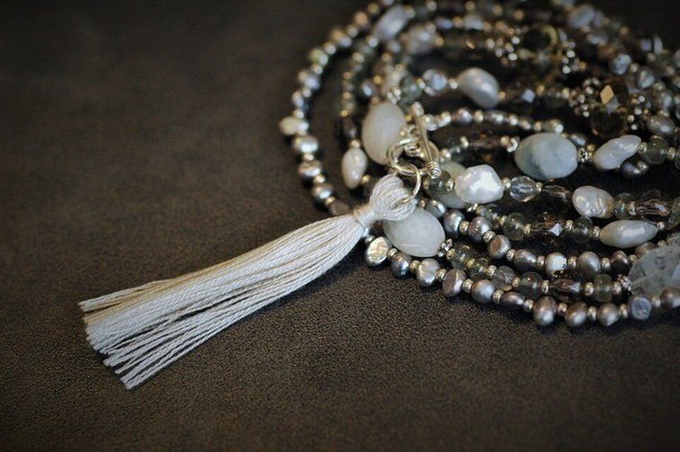 一連の半分はレモンクォーツやアクアマリンなどの天然石をランダムに繋ぎ、