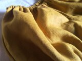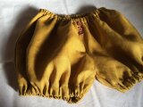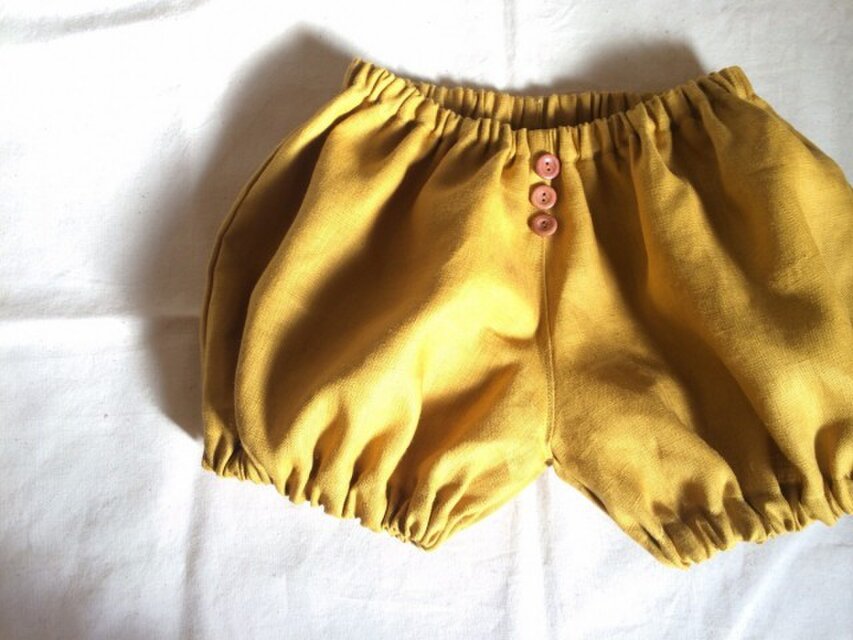 マスタード色のリネン作った1枚仕立てのバルーンパンツです。適度な張りと厚みのある生地で外遊びに適していそうです。