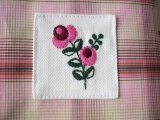 刺繍はミシン刺繍。表地は綿100%、裏地は綿100%のオフ白の生地です。