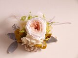 (プリザーブドフラワーは安全ピンで着けると重みでお花の顔が下を向いてしまいますので、コサージュピンのほうがおすすめです。)