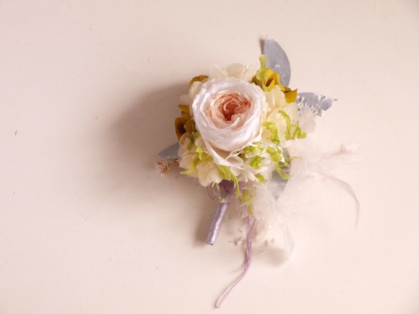 そんなローズの周りに淡い黄色やマスタードイエローのアジサイや羽を合わせ、
