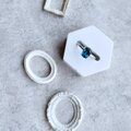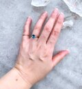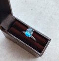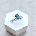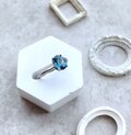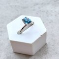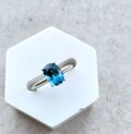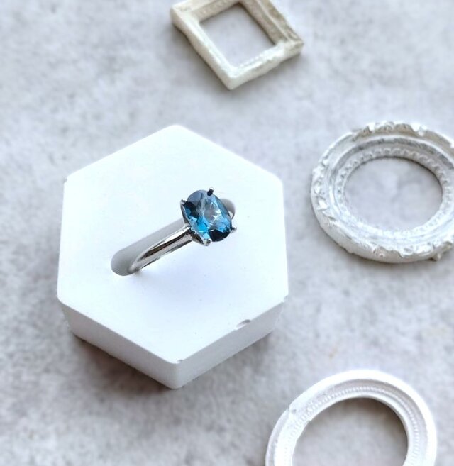 オーバルカットの深いシックブルーの天然石とシルバー色の指輪。深いブルーはロンドンブルートパーズ。様々な色が存在するとパースの中でロンドンの空の色に例えられる、色のトパーズ。