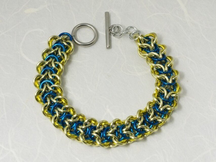 ジャンプリングにはアノダイズドアルミニウムのペールイエロー、イエロー、ロイヤルブルーの3色を使用、留め具はステンレススチールのトグルクラスプです。