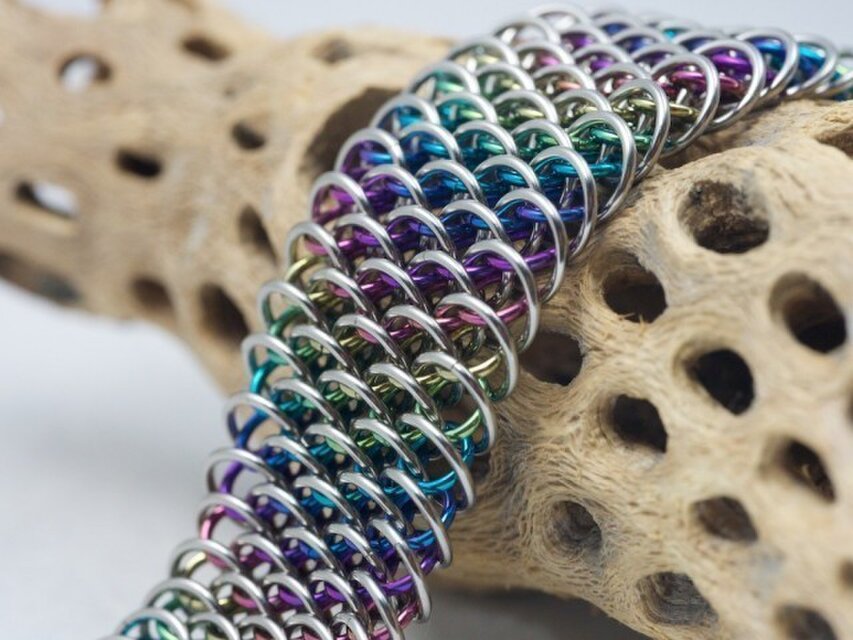 "Dragonscale Sheet Weave"で編んだチェーンメイルのブレスレットです。