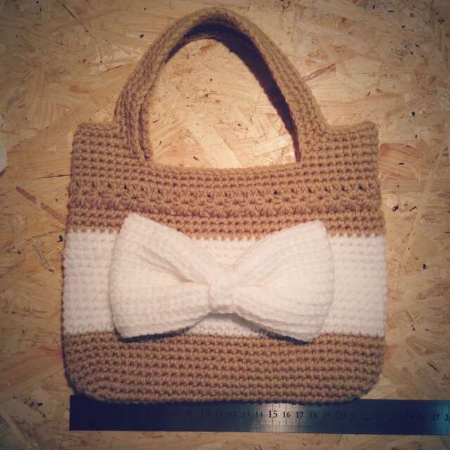 毛糸で編んだリボンが可愛いミニバッグになってます。