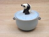 こちらの器には、花のような切れ込みがありません。その代わりに小さな丸い耳が二つ付いています。蓋の上でパンダが爆睡しています。春眠暁を覚えず。作品名に難しい漢字が並んでいます。今までのパターンだとアクアブルー・スリーピングパンダ・キャンディーボックス−Aと、とても長くなるので漢字にしてみました。なんだか伝統工芸の偉い先生の作品みたいですね。名前だけとても格調高いです。でも、気軽にお使いください。飴入れとなっていますが、飴以外にもお好きな物を入れてお楽しみ下さい。大きさは、直径が約95ミリ、パンダを含めた高さは約100ミリです。動物園では、パンダさんはいつも寝てばかりなので、こんな作品にしてみました。机の隅や、引き出しの中に潜ませたりして、ストレスを感じたときに、飴でリフレッシュしつつ、パンダで癒されてください。