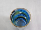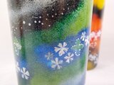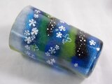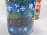 中くらいのグラスに元気色を入れて、もこもこお花を手描きいたしました。お花の部分は凹凸を付けて印象深くしています。ところどころ透明部分を作り変化をつけました。元気が出る色とデザインに仕上がったと思うのです。美味しいお水を飲んでください。いかがでしょうか?