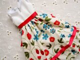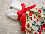 リバティの肌触りのよい、かわいらしいプリントの生地を使用してみました。白のブラウスに赤のリボンがアクセンに。