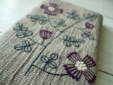 花刺繍の新書ブックカバー 薄あずき綿麻混