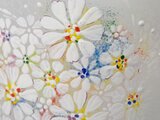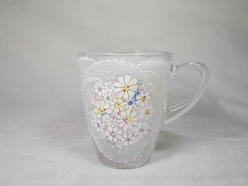 ガラスのマグカップに手描きました。ずっと表現したかった技法です。満足のいく内容になりました。刺繍のようにお花をコツコツ描きレース模様で仕上るとさらに奥行きのあるデザインになったと思うのです・・^^いかがでしょうか?