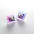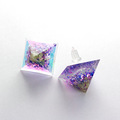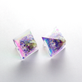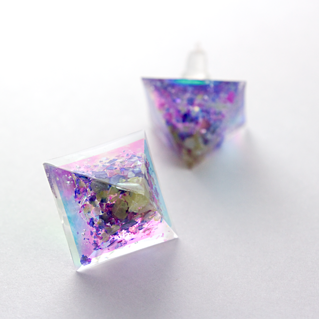 様々なカラーに輝くオーロラとパープル系のシェルパーツをクリスタルレジンで閉じ込めたピラミッド型のピアスです。