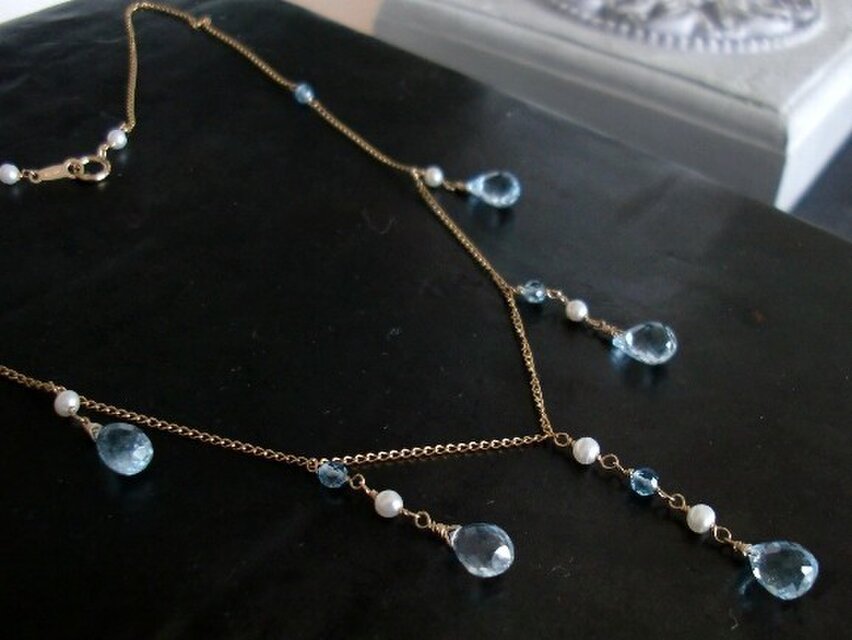 水色の美しいスカイブルートパーズを、水と滝のイメージでネックレスに仕上げました。淡水パールとスイスブルートパーズをあわせて、流れ出す“水”のイメージです。きらめく淡い水色のブルートパーズがとても美しく、存在感があるので、シンプルな服につけて頂くと映えると思います。