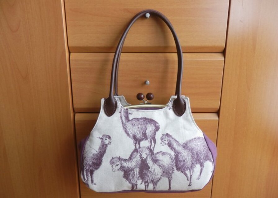 とぼけた表情のアルパカがユニークなさらっとしたコットンリネンとあつらえたようにぴったりのカラーリネンで、あおりポケットが便利ながま口バッグを作りました。