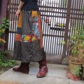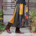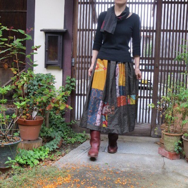 渋大島紬に銘仙パッチでリメイクスカート☆茶や黄色で明るく