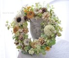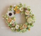 リース資材:アーティフィシャルフラワー(ヘリクリサム・アリューム・ヴィオラ・カモミール・ユーカリ・、など)、自然素材のドライ資材:(松かさ・ソーラーひまわり・カーリーモス、など)、その他(コットンのリボン飾り← リース左上のリボンは取り外しできます)