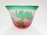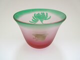 ほんのりピンク色のグラスに正面は菊の花。背面には和柄の鳥をあしらいました。