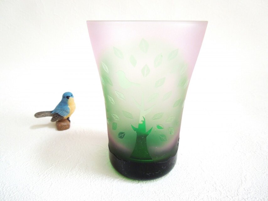 ほんのりピンク色のグラスに1本の木と、そこにとまる小鳥をメルヘンチックに表現してみました。背面には木の葉が舞い小鳥を飛ばしてみました。