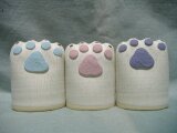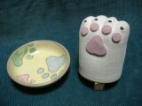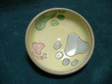 小皿もロクロ成形した後、白化粧土を掛け肉球を水色、緑、ピンク、黄色で描き、透明釉を掛け焼き上げました。